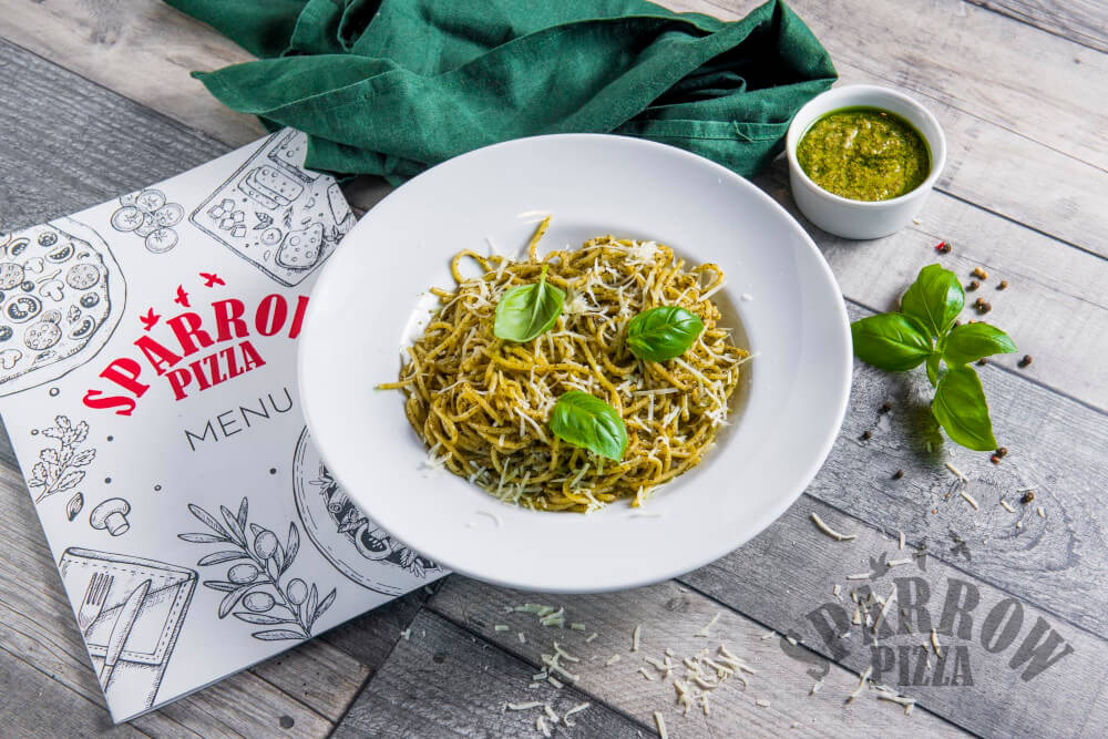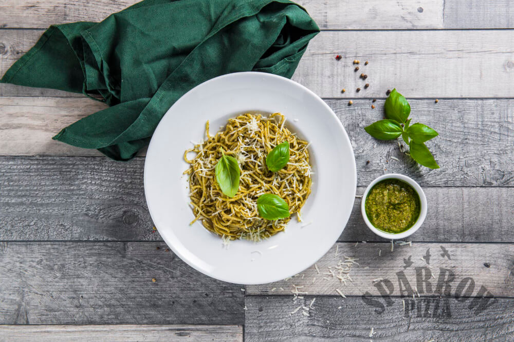 Z makaronem spaghetti, sosem pesto, serem mascarpone, parmezanem i bazylią.