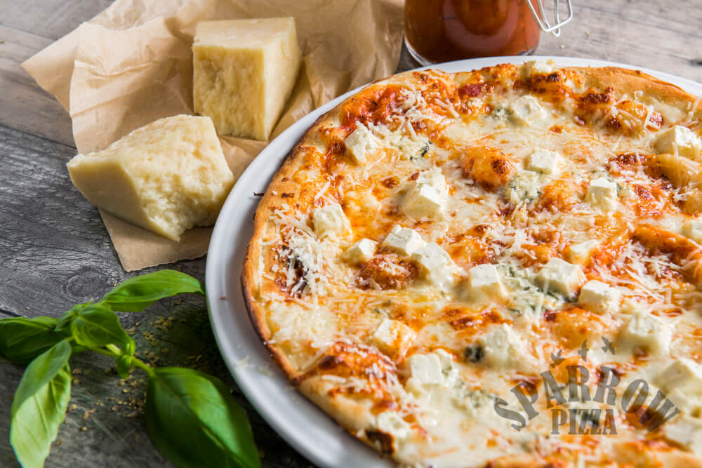 Z serem, serem pleśniowym lazur, serem sałatkowym typu greckiego i serem parmezan.