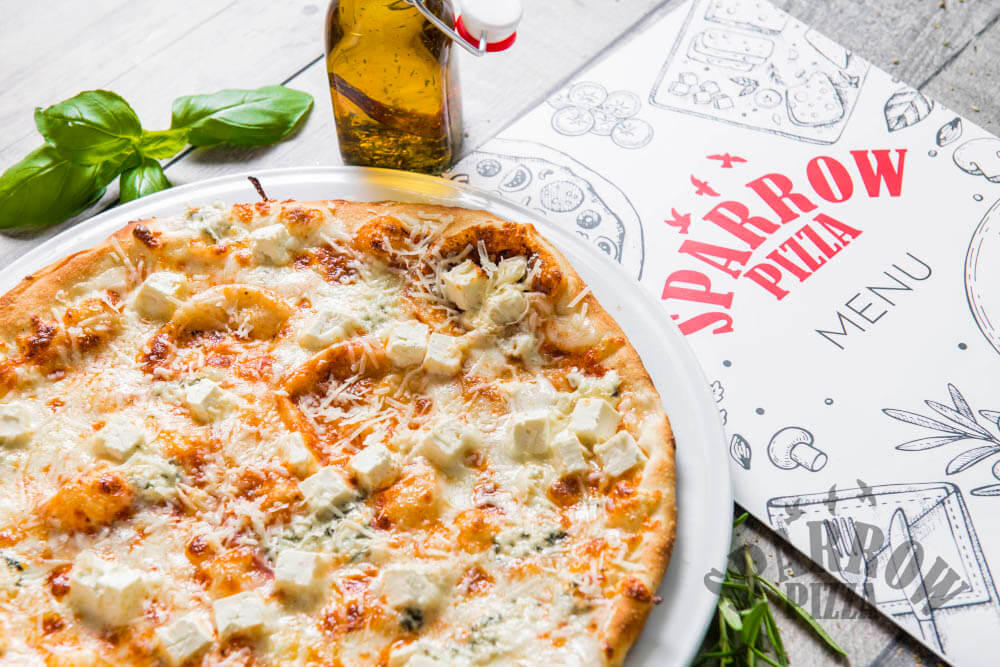 Z serem, sosem pomidorowym, serem pleśniowym lazur, szynką prosciutto crudo, gruszką, rukolą, orzechami włoskimi i sosem balsamicznym.