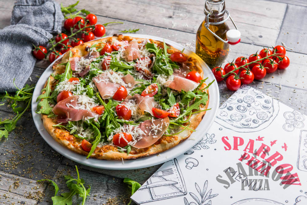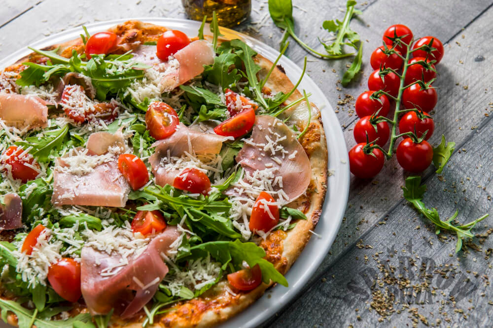 Z serem, sosem pomidorowym, szynką prosciutto crudo, rukolą, pomidorkami koktajlowymi i parmezanem.