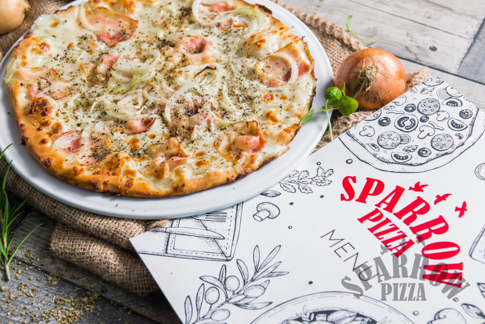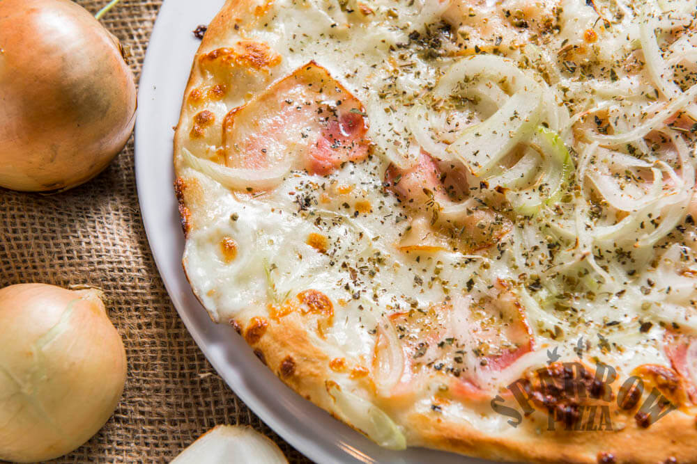 Z serem, sosem carbonara, boczkiem, cebulą, bazylią i oregano.
