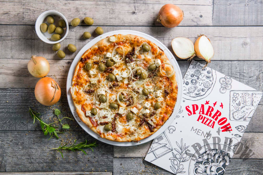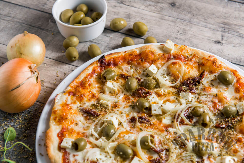 Z serem, sosem pomidorowym, oliwkami, serem sałatkowym typu greckiego, suszonymi pomidorami, cebulą i oregano.