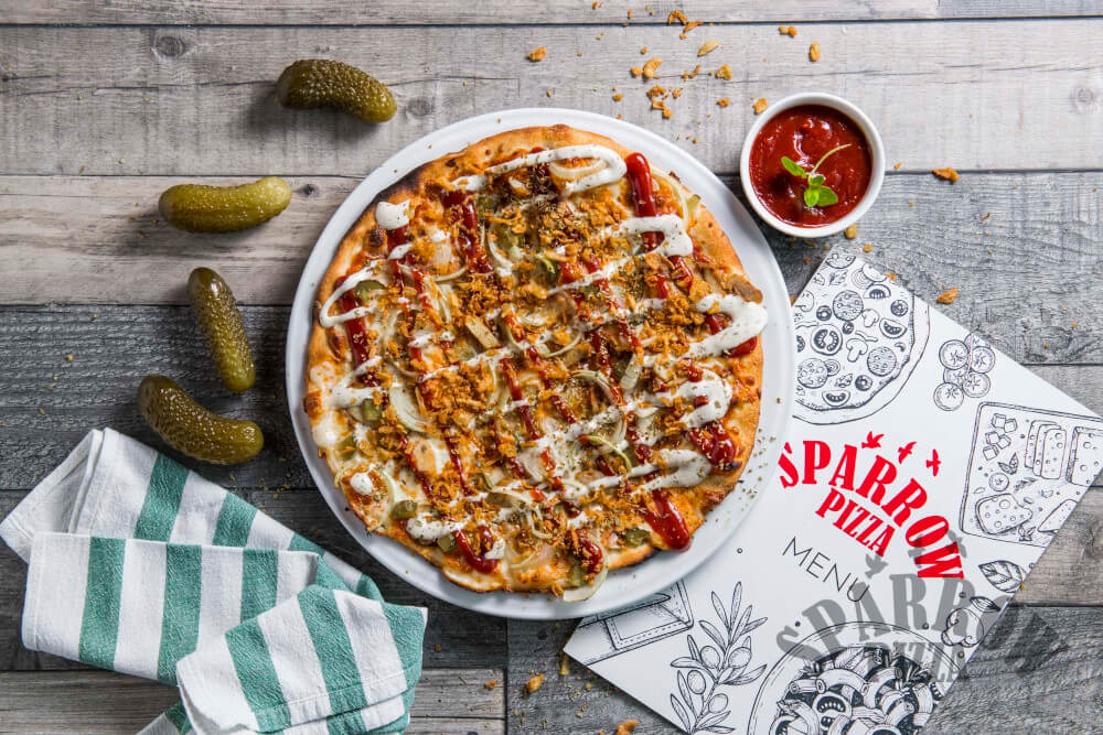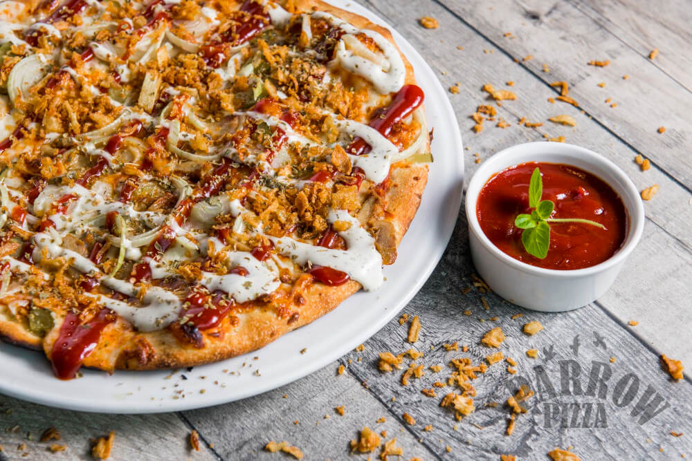 Z serem, sosem pomidorowym, kebabem z kurczaka, ogórkiem kiszonym, cebulą, cebulą prażoną, sosem gyros, sosem ketchup i oregano.