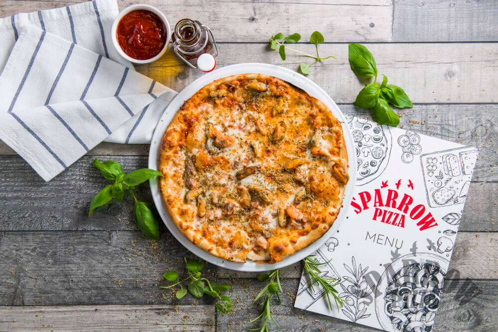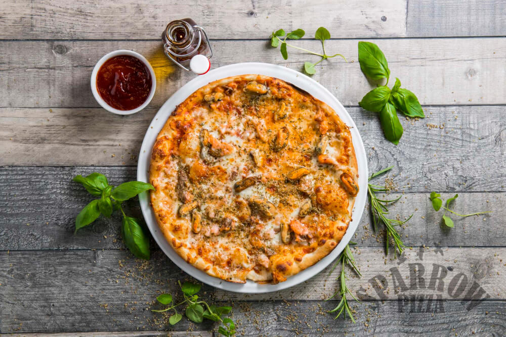 Z serem, sosem pomidorowym, małżami, krewetkami, łososiem, oliwą czosnkową i oregano.