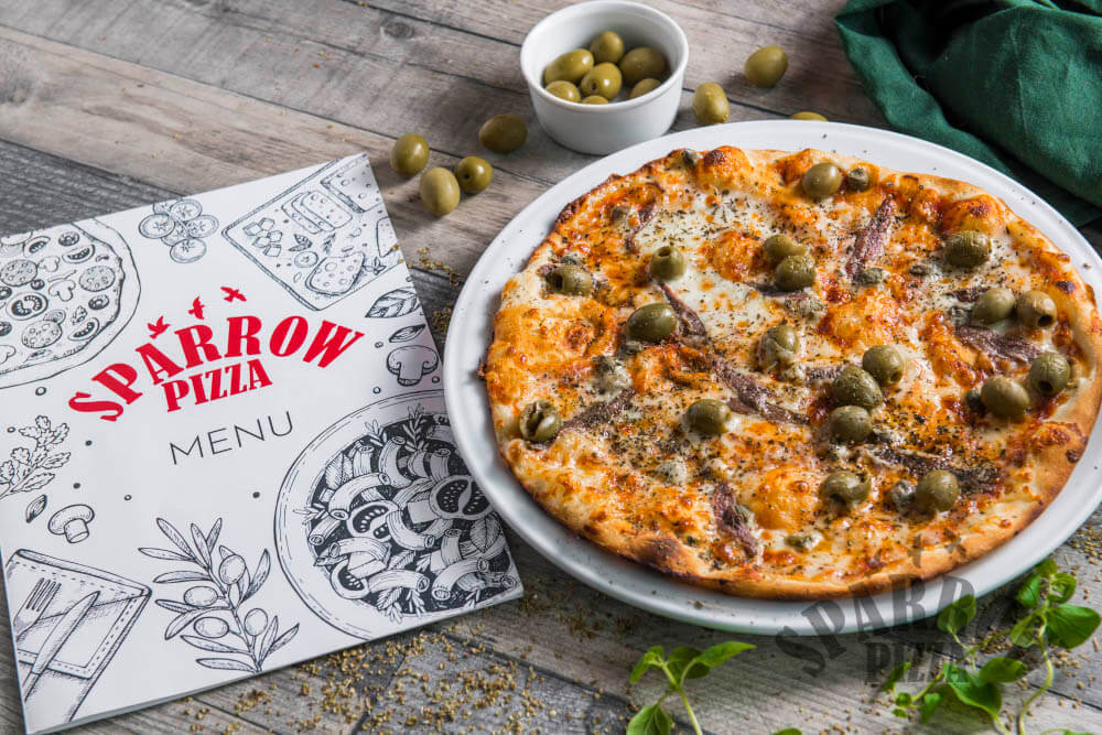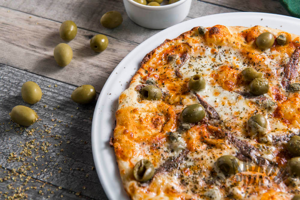 Z serem, sosem pomidorowym, oliwkami, kaparami, bazylią i anchois.