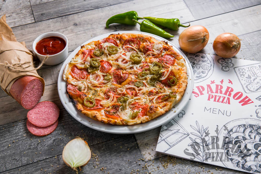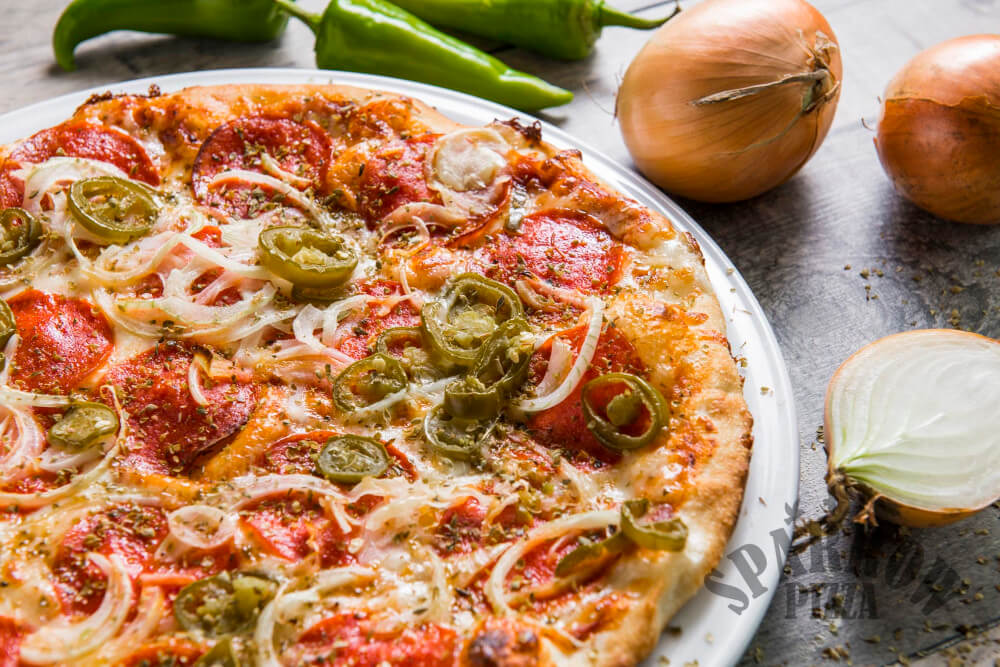 Z serem, sosem pomidorowym, salami pepperoni, papryczkami jalapeno, cebulą i oregano.