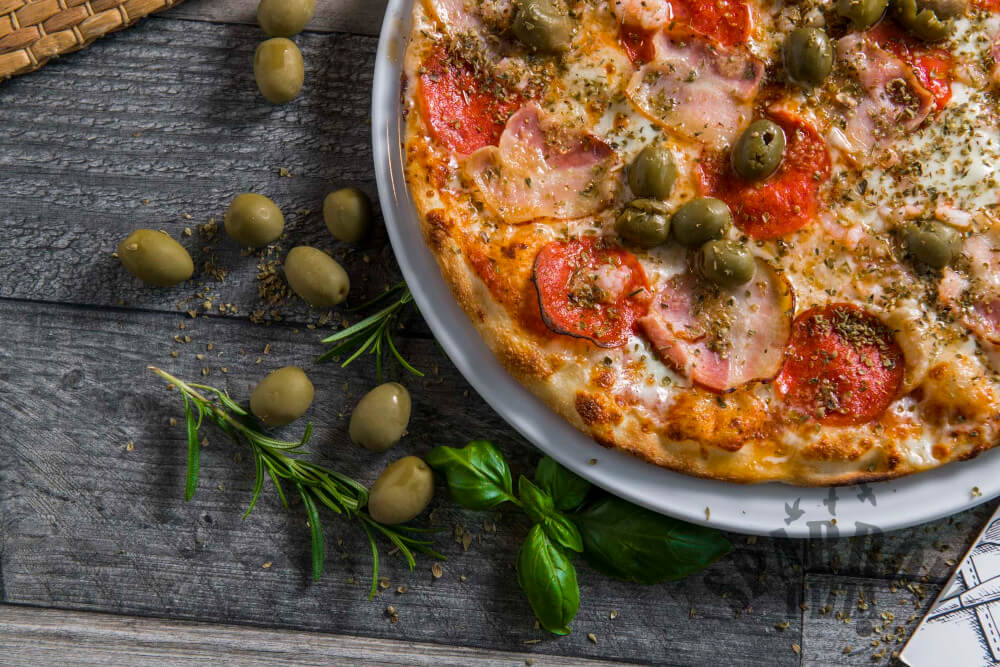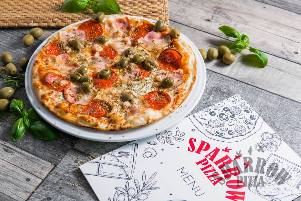 Z serem, sosem pomidorowym, oliwkami, salami, boczkiem, krewetkami, oliwą czosnkową i oregano.
