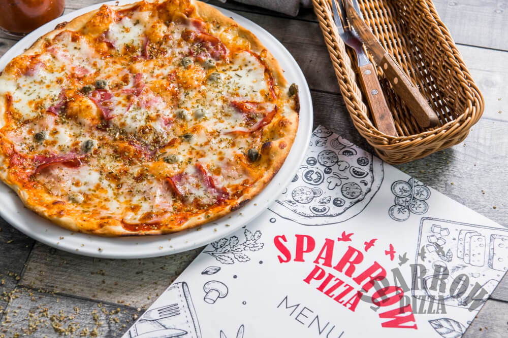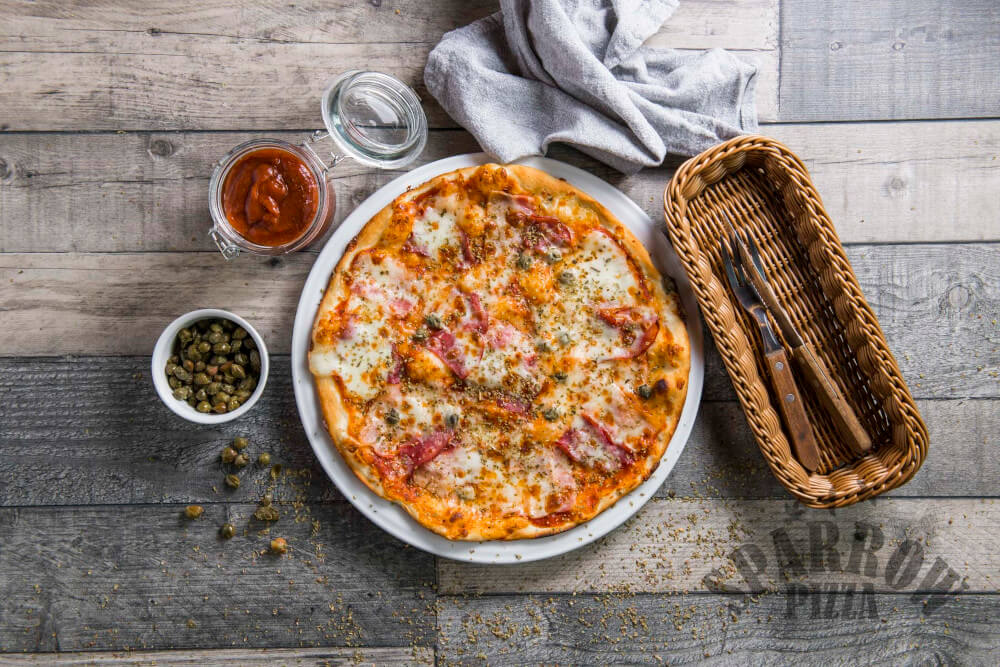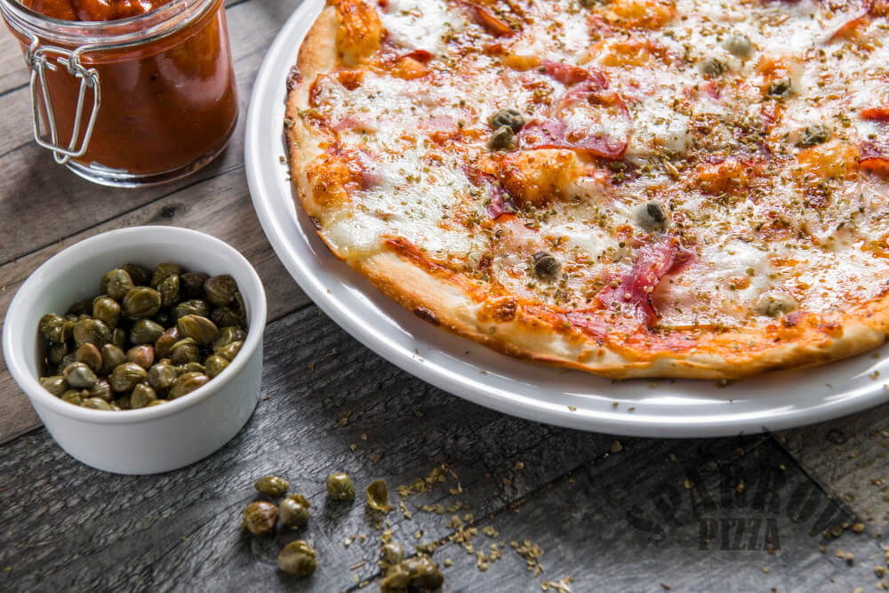 Z serem, sosem pomidorowym, szynką dojrzewającą, bekonem, kaparami i oregano.