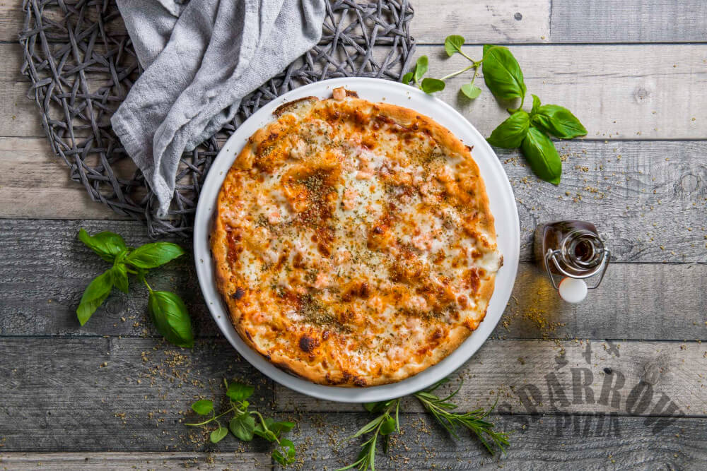 Z serem, sosem pomidorowym, krewetkami, oliwą czosnkową i oregano.