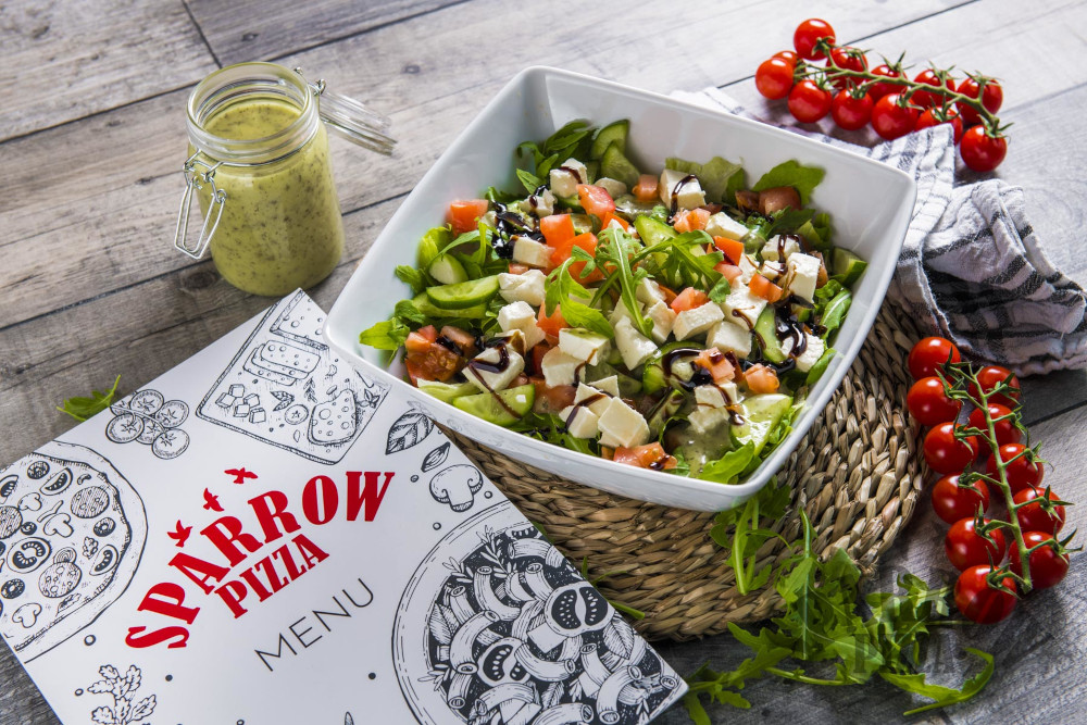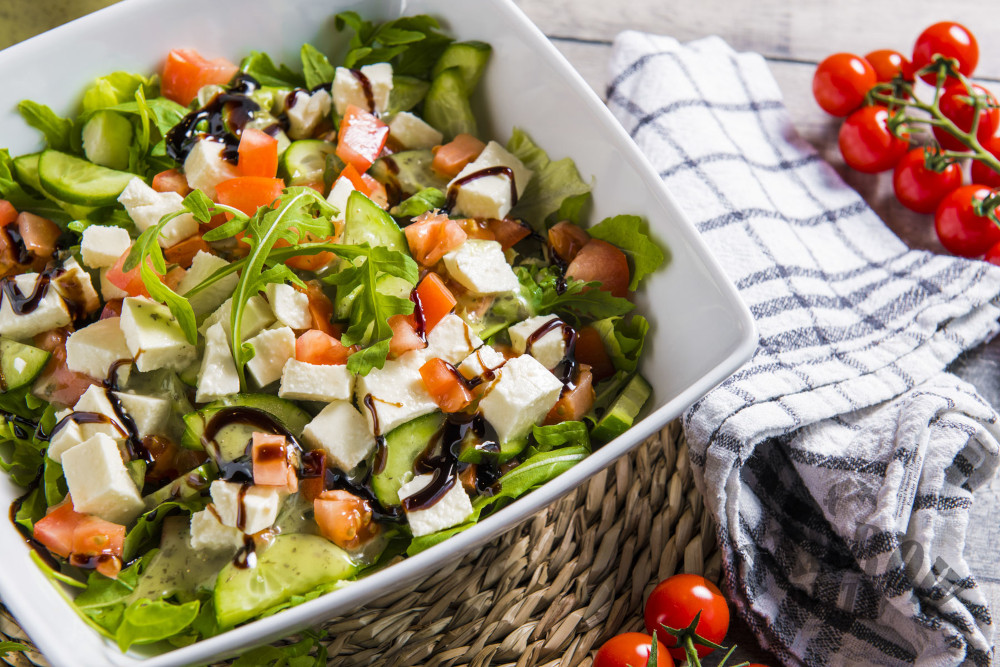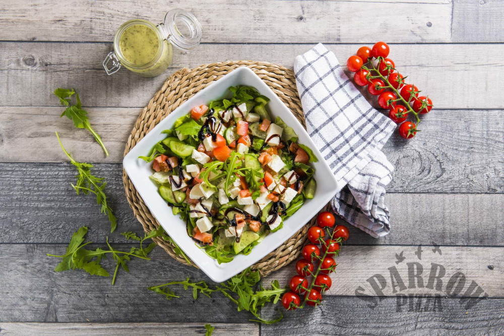 Z sałatą lodową, rukolą, serem mozzarella, pomidorami, ogórkiem, sosem winegret i sosem balsamicznym.