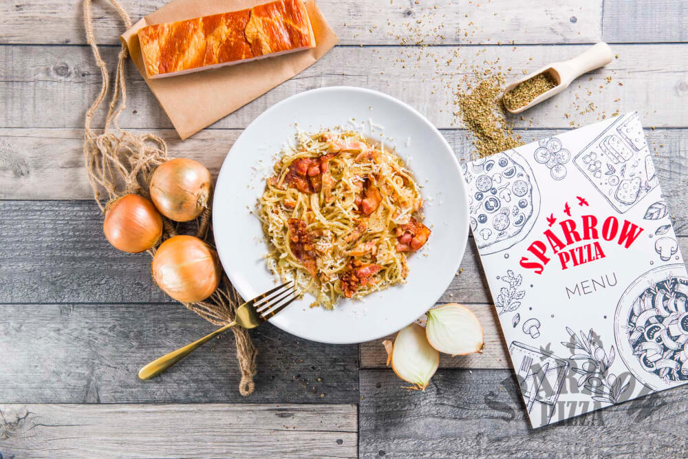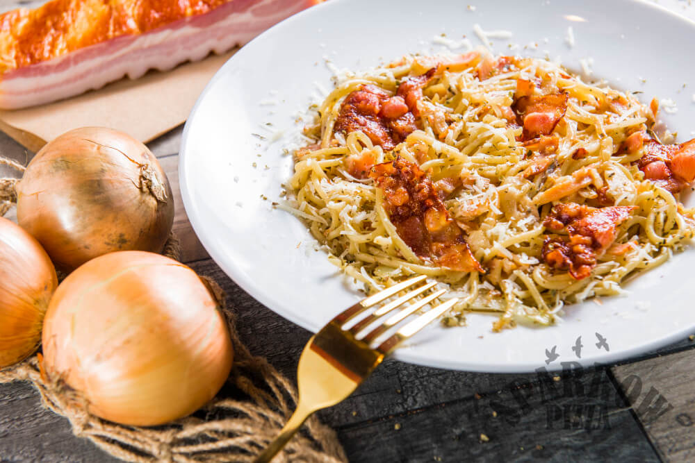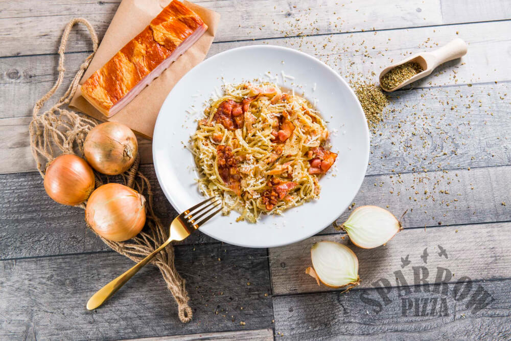 Z makaronem spaghetti, sosem carbonara, bekonem, cebulą, parmezanem, bazylią.